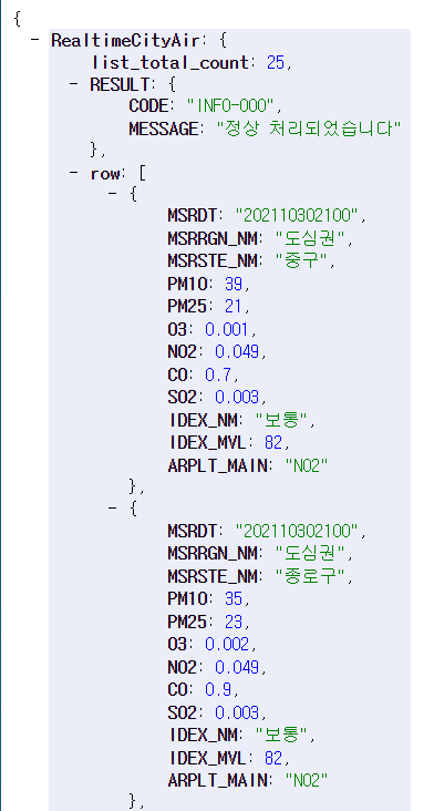 http://openapi.seoul.go.kr:8088/6d4d776b466c656533356a4b4b5872/json/RealtimeCityAir/1/99
