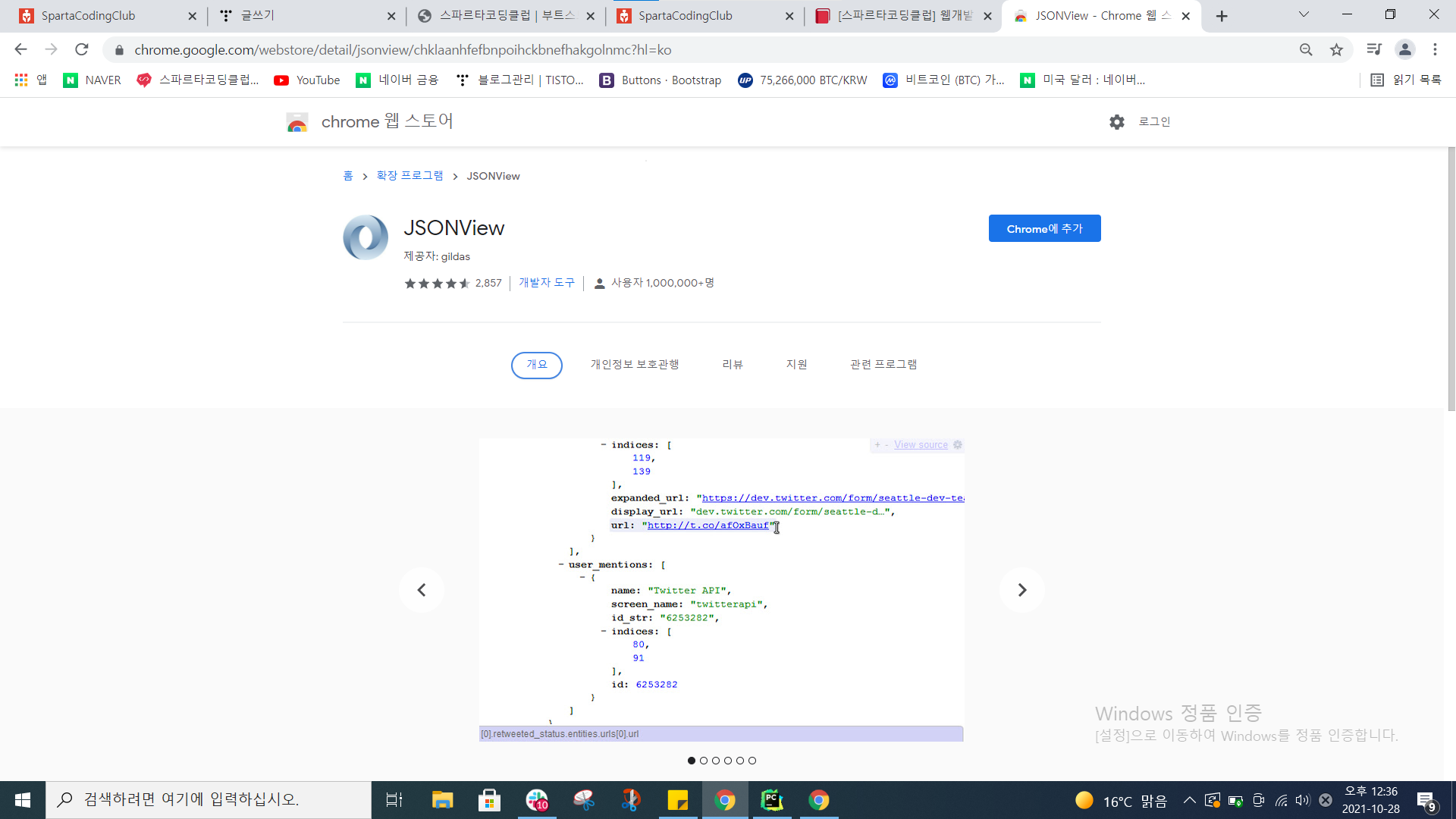 카테고리 없음 JSONView 확장프로그램 별코딩 2021. 10. 28. 12:38 이런 화면을 http://openapi.seoul.go.kr:8088/6d4d776b466c656533356a4b4b5872/json/RealtimeCityAir/1/99 https://chrome.google.com/webstore/detail/jsonview/chklaanhfefbnpoihckbnefhakgolnmc?hl=ko JSONView Validate and view JSON documents chrome.google.com 이렇게 깔끔하게 바꿔줌 공유하기 게시글 관리 코딩마스터16 저작자표시 (새창열림)